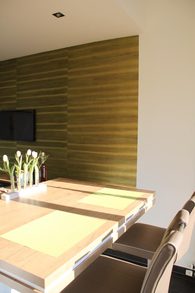 Warm, hell und freundlich sehen diese Tapeten in der Küche aus, die Blattmotive schaffen ein modernes Aussehen.